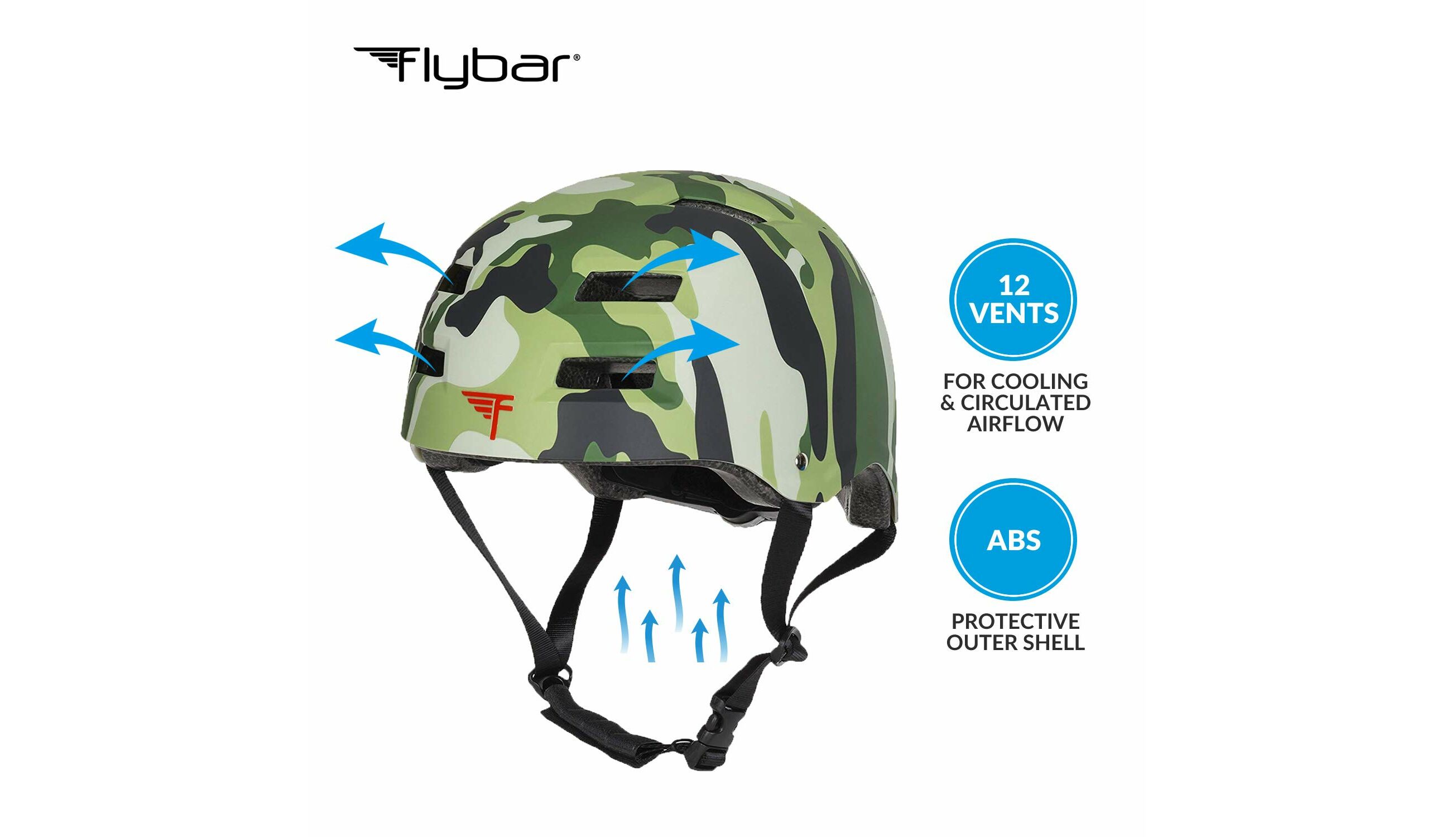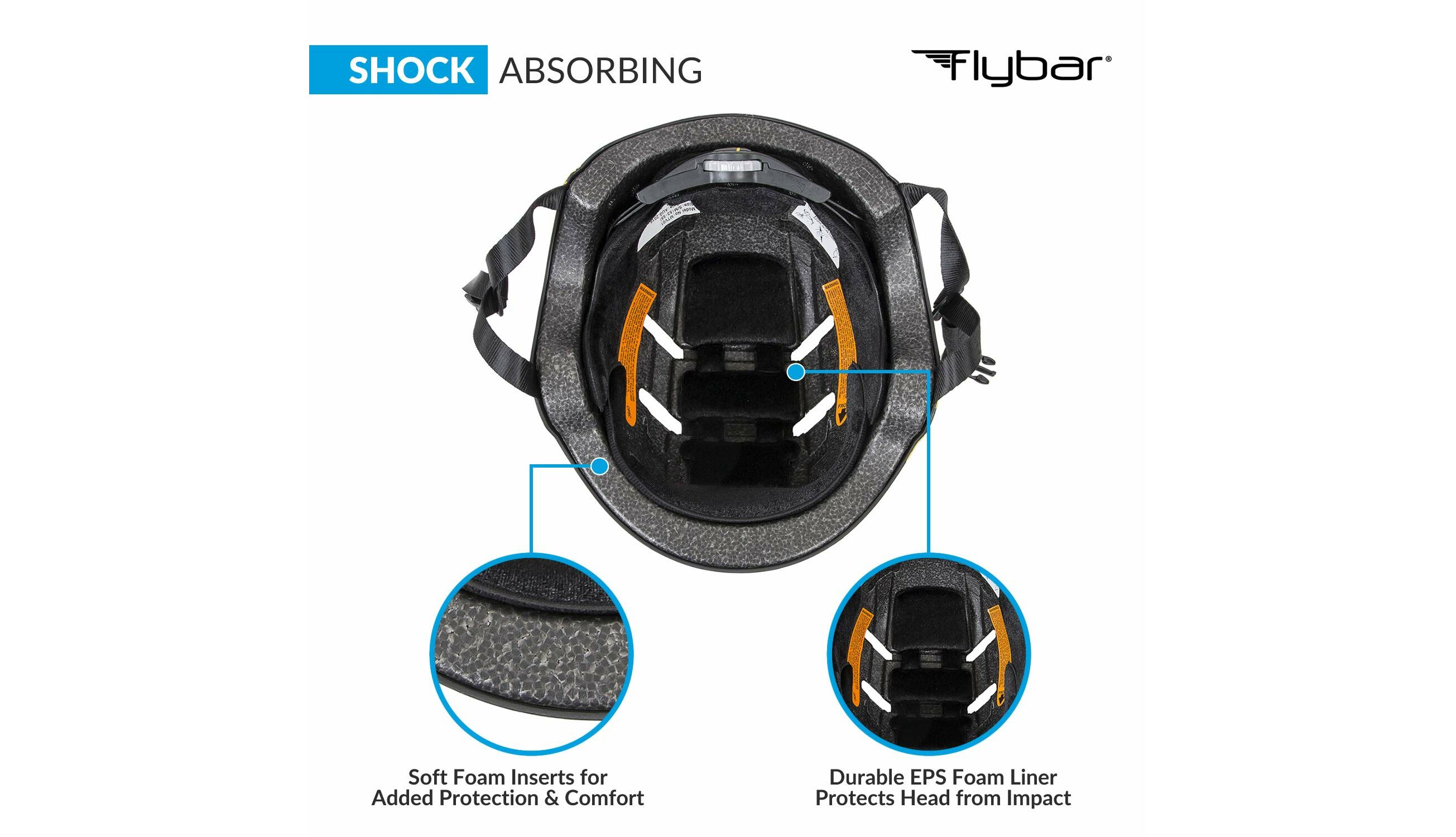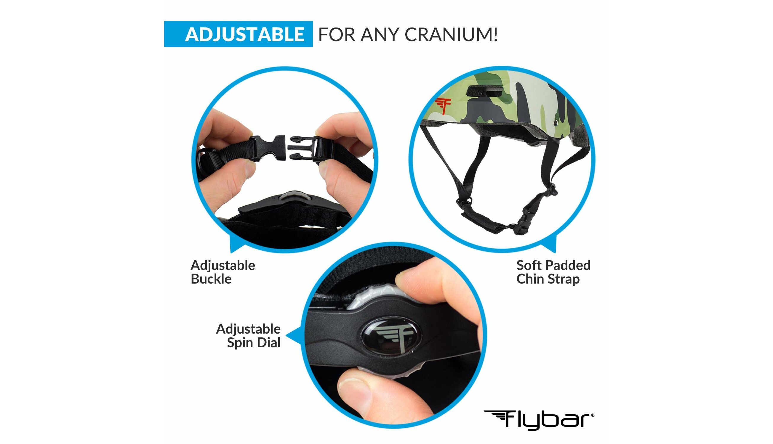 Τα κράνη της Flybar διαθέτουν προσαρμοζόμενο λουρί για να δένουν με ασφάλεια στο κεφάλι του αθλητή και περιστρεφόμενη ροδέλα στο πίσω μέρος που επιτρέπει την πλήρη προσαρμογή του κράνους στο μέγεθος του κεφαλιού.