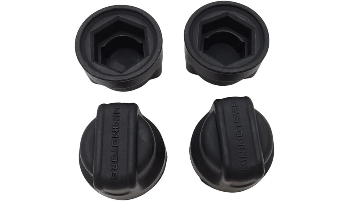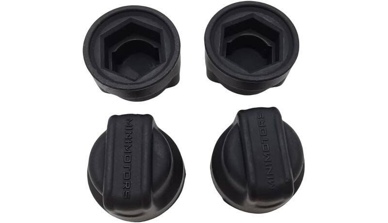 Καπακιά παξιμαδιών τροχού M12 από μαύρο καουτσούκ, συμβατά με όλα τα μοντέλα Dualtron που χρησιμοποιούν παξιμάδια M12. Κατασκευασμένα από ανθεκτικό καουτσούκ με το λογότυπο Minimotors, προστατεύουν από τη σκόνη, τη σκουριά και τις κρούσεις. Η έκδοση χωρίς οπές ταιριάζει σε άξονες κινητήρα με καλώδια περασμένα μέσα στον βραχίονα ανάρτησης. Περιλαμβάνει 2 καπάκια παξιμαδιών ανά σετ.