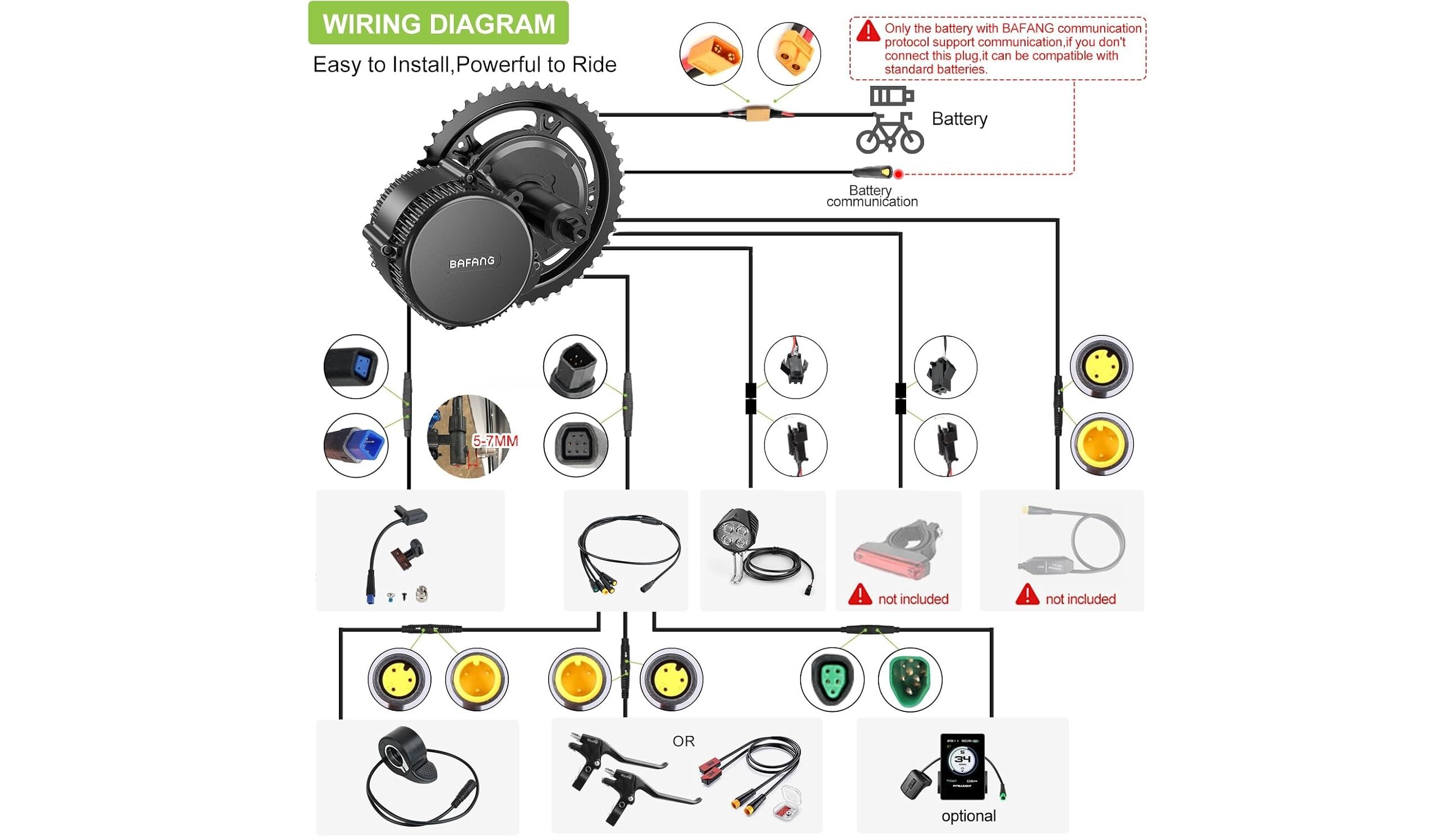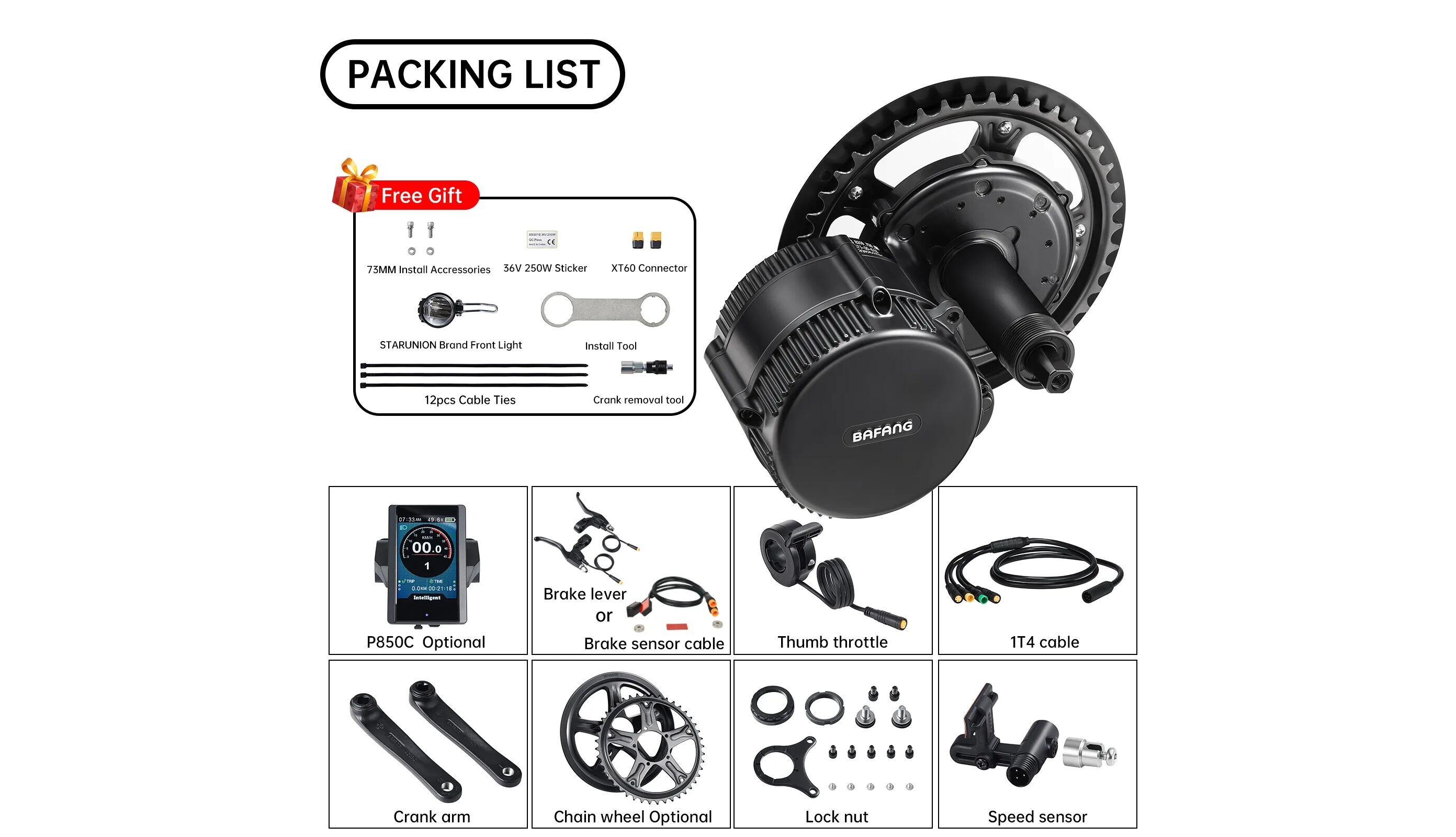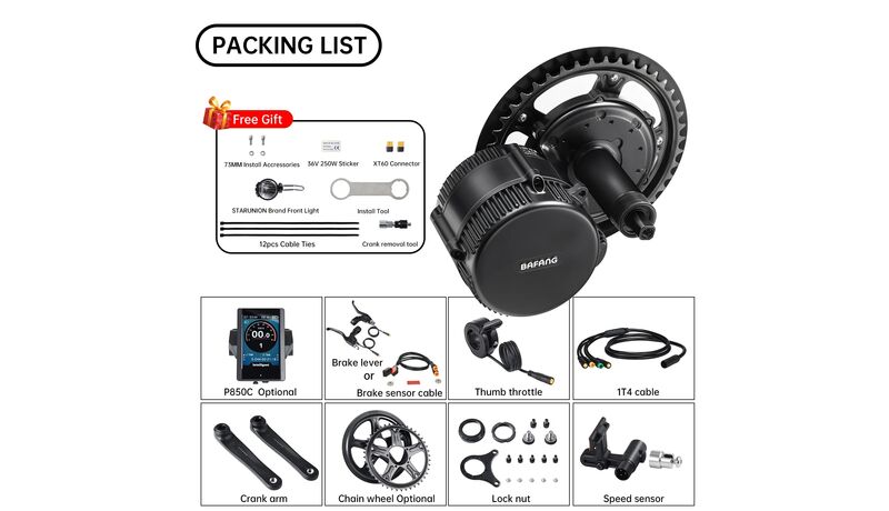 Το κιτ μας συνοδεύεται με όλα τα απαραίτητα αξεσουάρ, συμπεριλαμβανομένου του κινητήρα Bafang Mid-drive, του μοχλού φρένου ή των καλωδίων αισθητήρα υδραυλικού φρένου, του αντίχειρα γκαζιού, του τροχού αλυσίδας, της μανιβέλας, της οθόνης LCD Display C965, του αισθητήρα ταχύτητας, του σύρματος 1T4, των παξιμαδιών κλειδώματος, του κλειδιού και ενός προβολέα ebike.