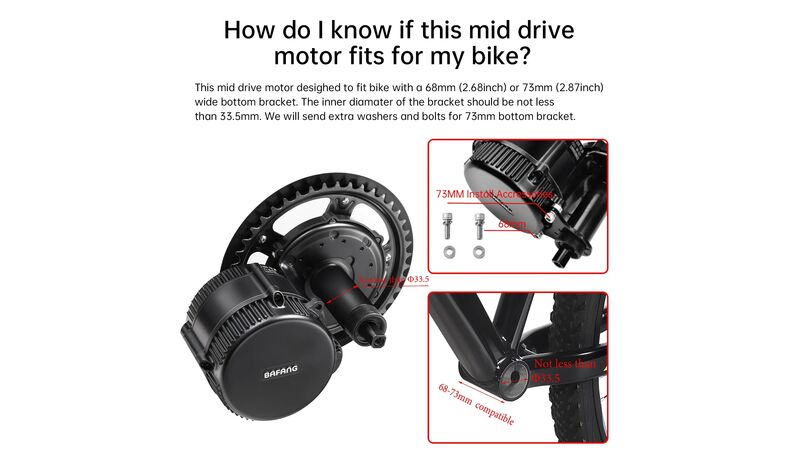 Αυτό το κιτ κινητήρα μεσαίας κίνησης BBS02B έχει σχεδιαστεί για να ταιριάζει με στάνταρ κάτω βραχίονα JIS 68-73 mm (μήκος) και 33,5-36 mm (εσωτερική διάμετρος), καθιστώντας το συμβατό με τα περισσότερα ποδήλατα. Ανεξάρτητα από το μέγεθος του ελαστικού σας.
