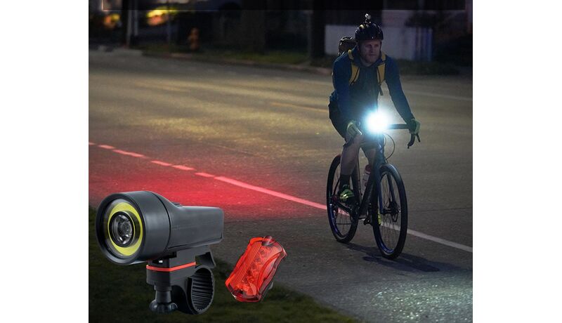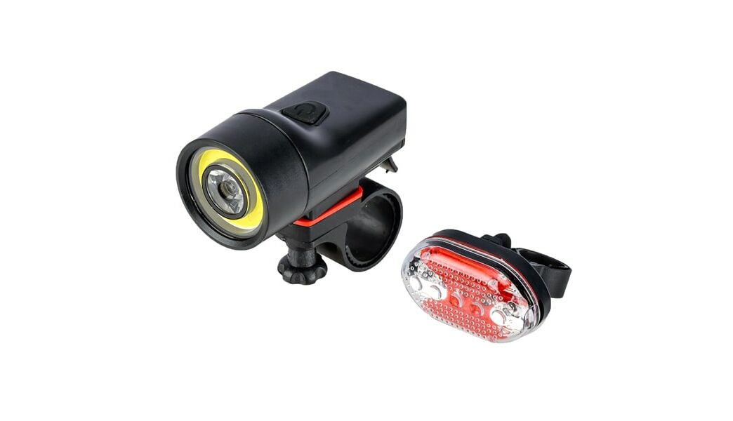 Σετ φωτισμού ποδηλάτου που αποτελείται από ένα εμπρόσθιο φως με ένα ισχυρό COB-LED 5 W και ένα οπίσθιο με 5 led 0.5 w. Τροφοδοτούνται με μπαταρίες τύπου ΑΑΑ (3x το εμπρός και 2x το πίσω) και διατίθεται σε μαύρο και πράσινο χρώμα.